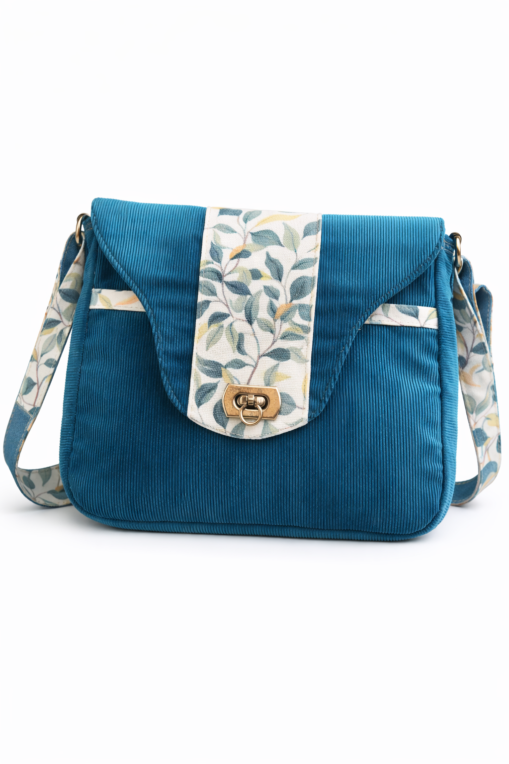 Besace réalisée en jean upcyclé, coton et velours cotelé bleu.