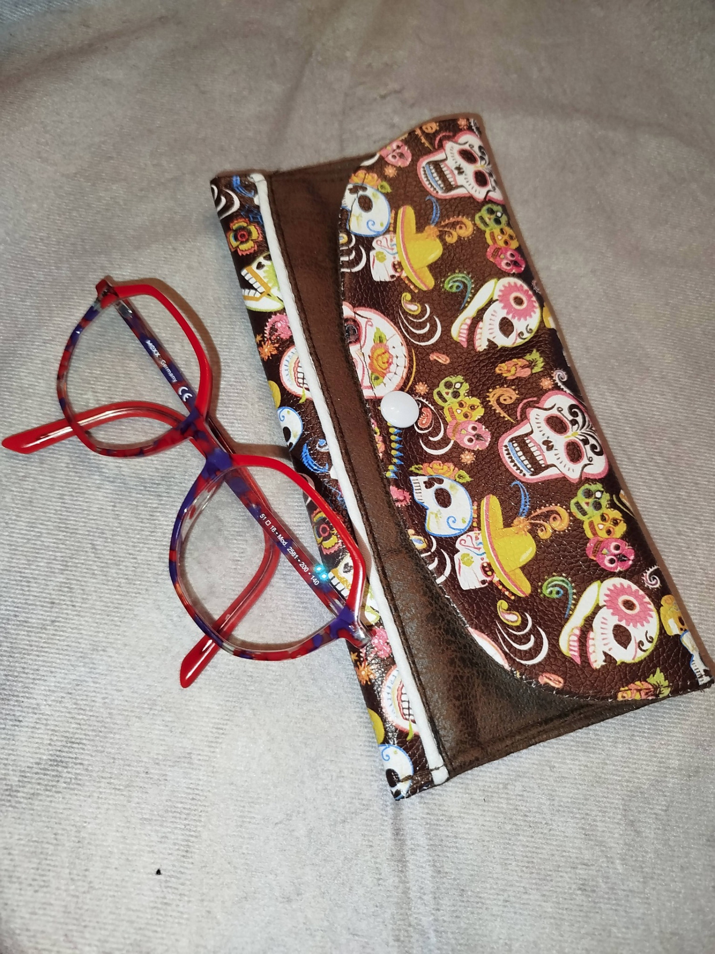 Étui à lunettes en simili et velours doublé.
