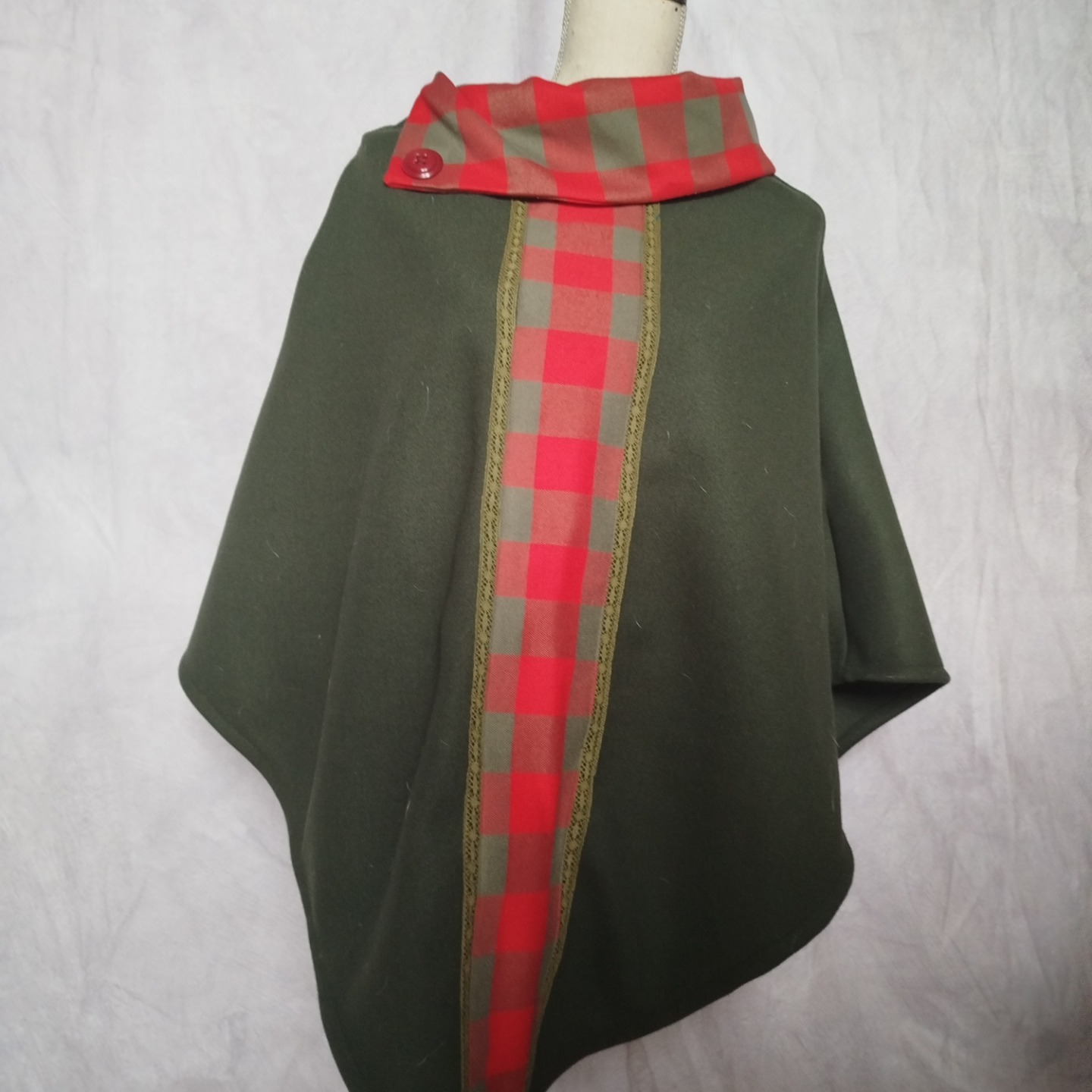 Poncho en lainage (100% polyester) fait à la main et tissu rouge corail à carreaux (50% polyester et 50% viscose)
