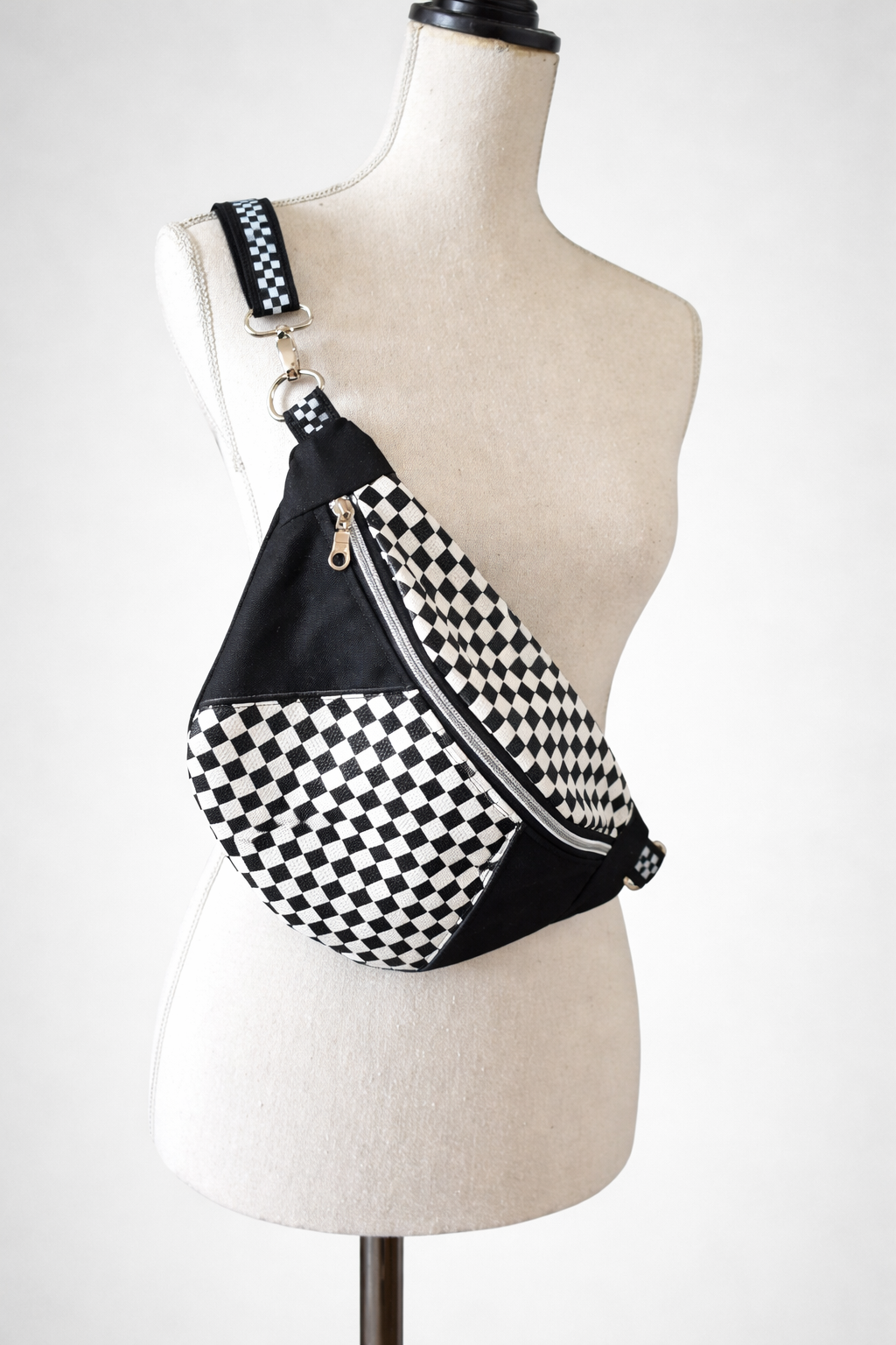 finitions. Extérieur en simili damier et jean noir, intérieur doublé en jean noir. Fermeture éclaire solide. Sangle ajustable.