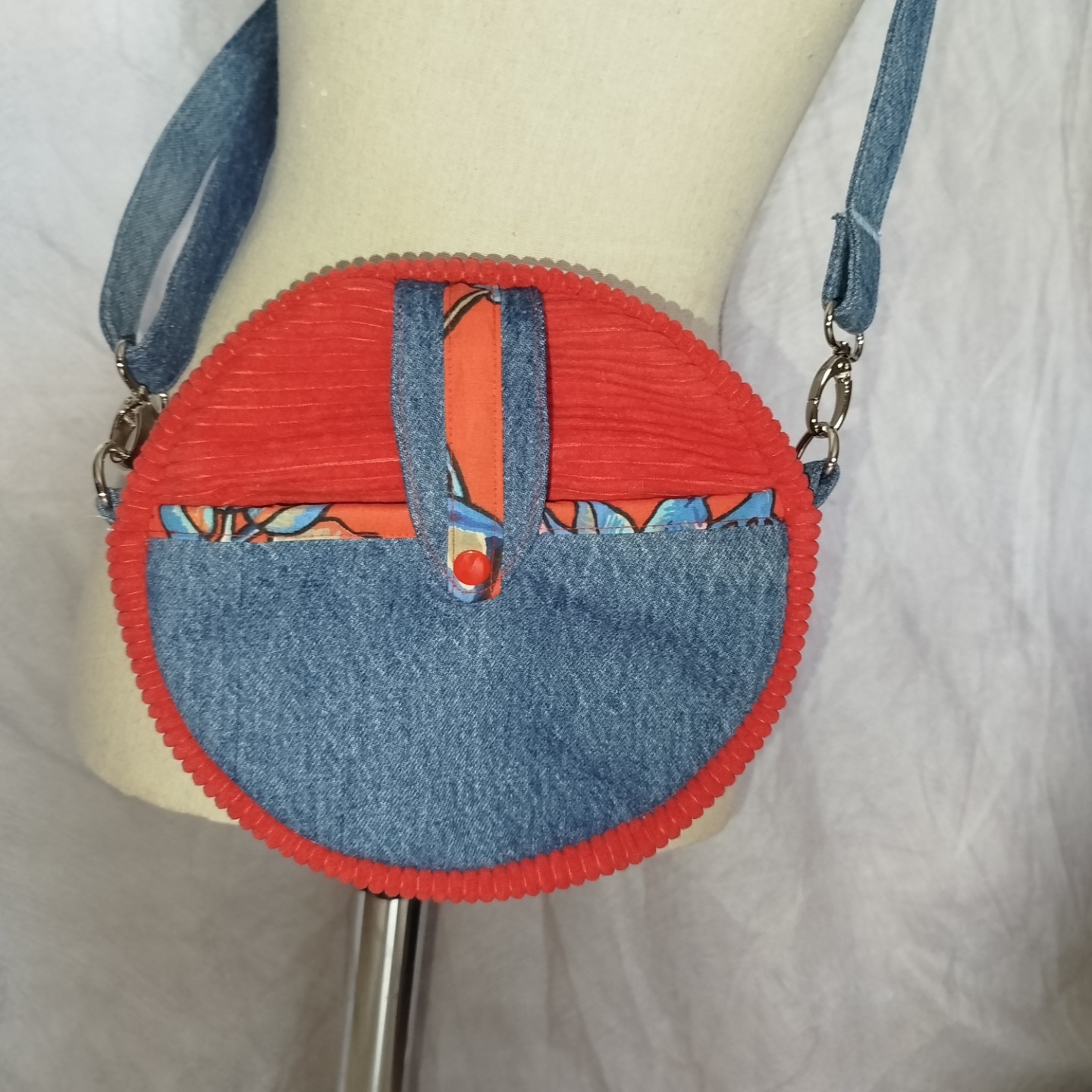 Sac à main circulaire en jean upcyclé, velours rouge corail et cotonnade à motifs assortis.