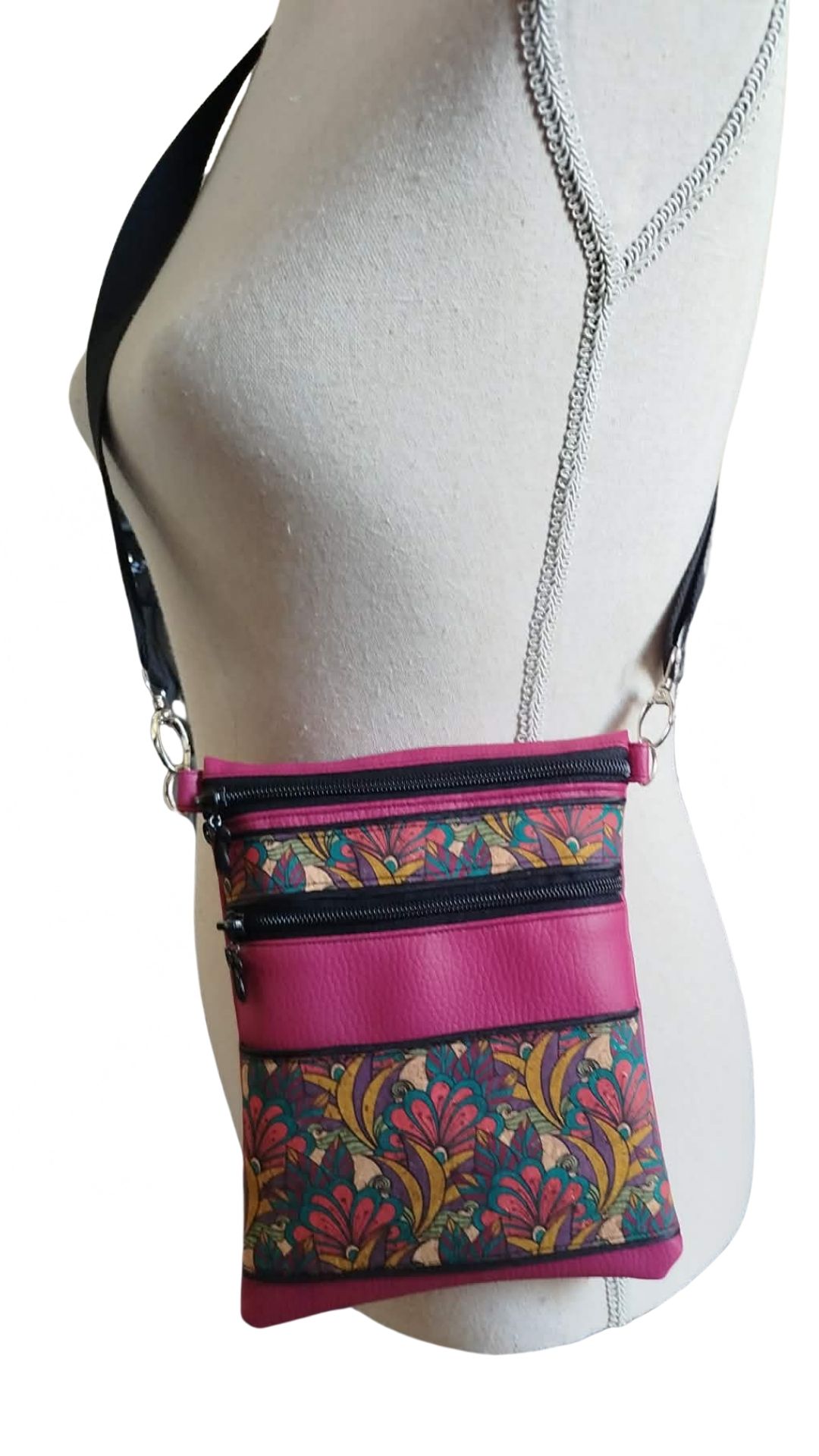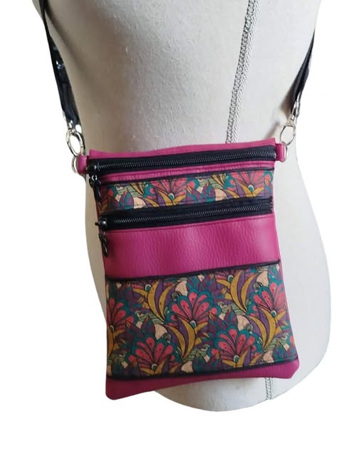 Taille idéale pour sortir avec le nécessaire, léger et peu encombrant. C'est pratique !! Pour les détails, elle fait 20cm de haut sur 15,5cm environ Elle a deux zips à l'avant. Sangle ajustable. Fabriquée en simili, liège et coton